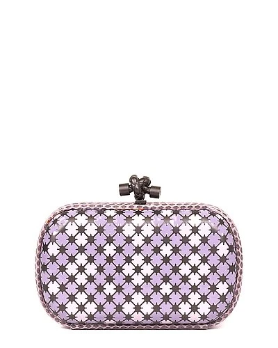 - Leather Clutch in multicolor leather and brass- tone hardware with multicolored outer design with twisted knot clasp