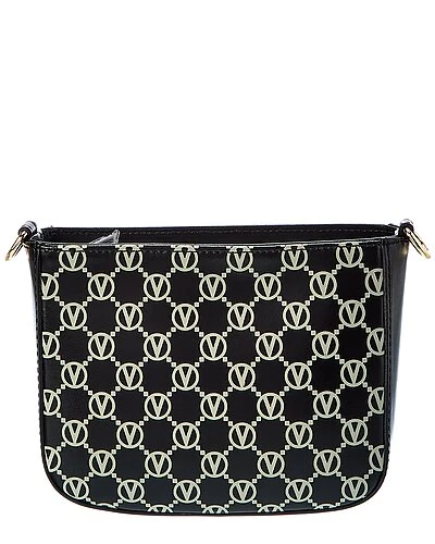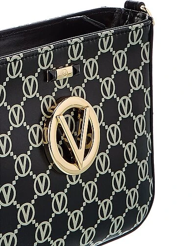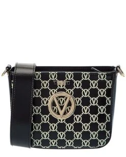 - Yvette Monogram Leather Crossbody in black leather and gold-tone hardware with monogram print, logo accent and zippered pouch at strap