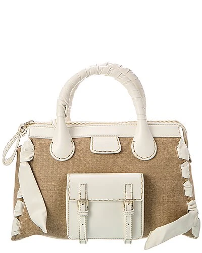 - Edith Day Medium Linen & Leather Satchel in natural linen canvas and white leather with gold-tone hardware, exterior pocket and wrapped handles