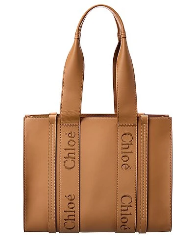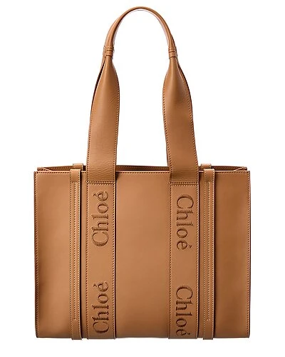 - Woody Medium Leather Tote in light tan leather with logo embroidery