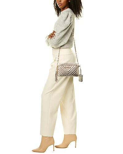 - Design details: gold-tone hardware, logo accent, tassel charm and chain strap
