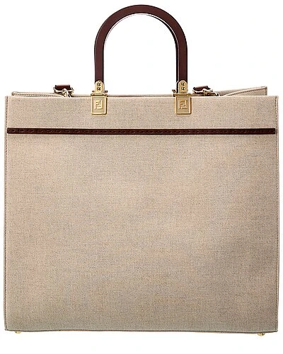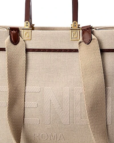 - Sunshine Medium Canvas Tote in beige canvas with gold-tone hardware and stiff leather handles