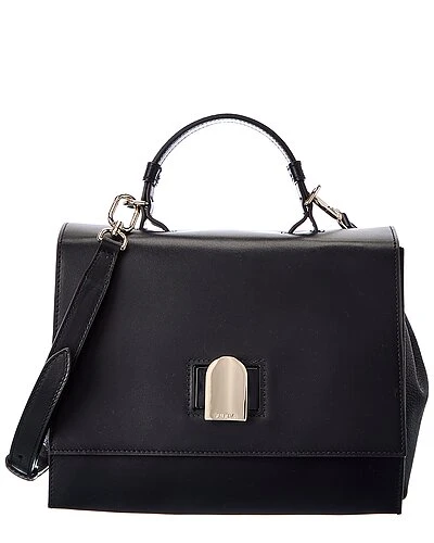 - Emma Small Top Handle Leather Satchel in nero leather and gold-tone hardware with exterior pocket