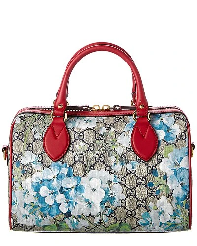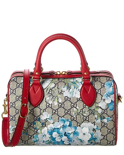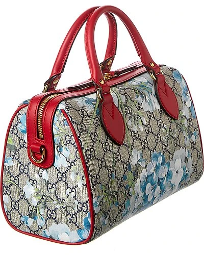 - GG Blooms Supreme Canvas & Leather Satchel in GG blooms Supreme canvas and red leather and light fine gold hardware
