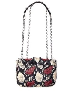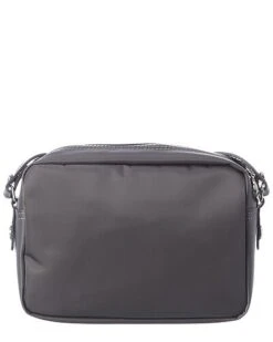 - Red nylon shoulder bag with gunmetal and gold-tone hardware and light brown pebbled leather accents