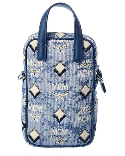 - Vintage Jacquard Monogram Canvas & Leather Crossbody in navy canvas and leather and silver-tone hardware with exterior pocket