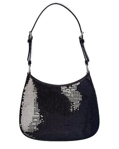 - Cleo Sequined Satin Shoulder Bag in black satin and steel finish hardware with sequin embellishments