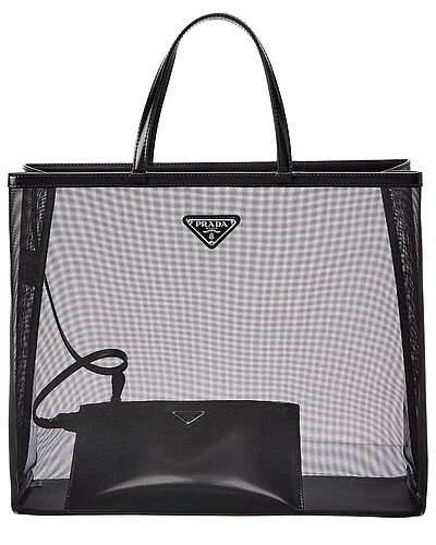 - Mesh & Leather Tote in black mesh and leather and steel finish hardware with logo accent