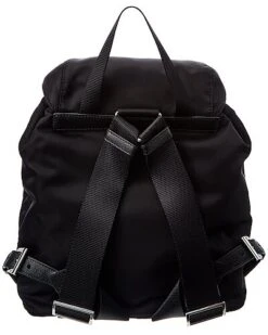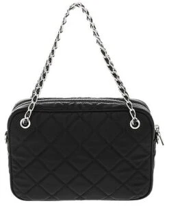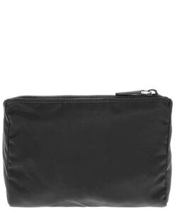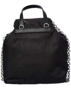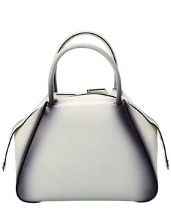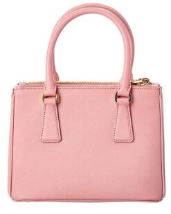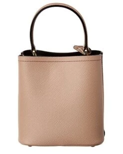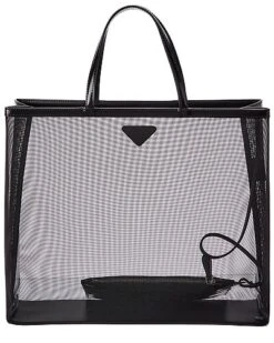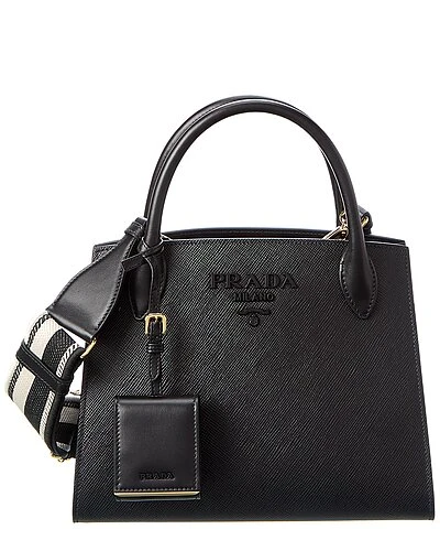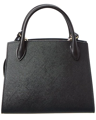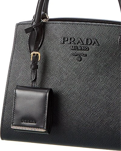 - Monochrome Small Saffiano Leather Tote in black saffiano leather and steel finish hardware with removable pouch charm
