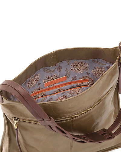 - Exterior design details: brushed antique brass hardware; front wall zip pocket; back wall cell pocket