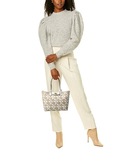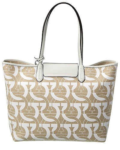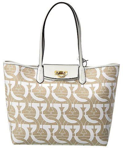 - Gancini Canvas & Leather Tote in white/natural printed canvas and leather with gold-tone hardware