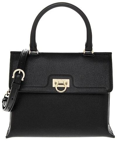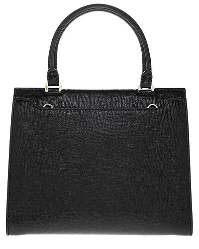 - Trifolio Small Leather Satchel in black leather and gold-tone hardware with slip pocket on the back