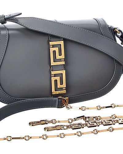 - Greca Goddess Leather Shoulder Bag in grey leather and gold-tone hardware with logo accents and interchangeable shoulder straps