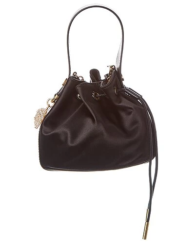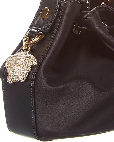 - Mini Satin & Leather Bucket Bag in black satin and leather and gold-tone hardware with crystal-embellished Medusa head logo accent